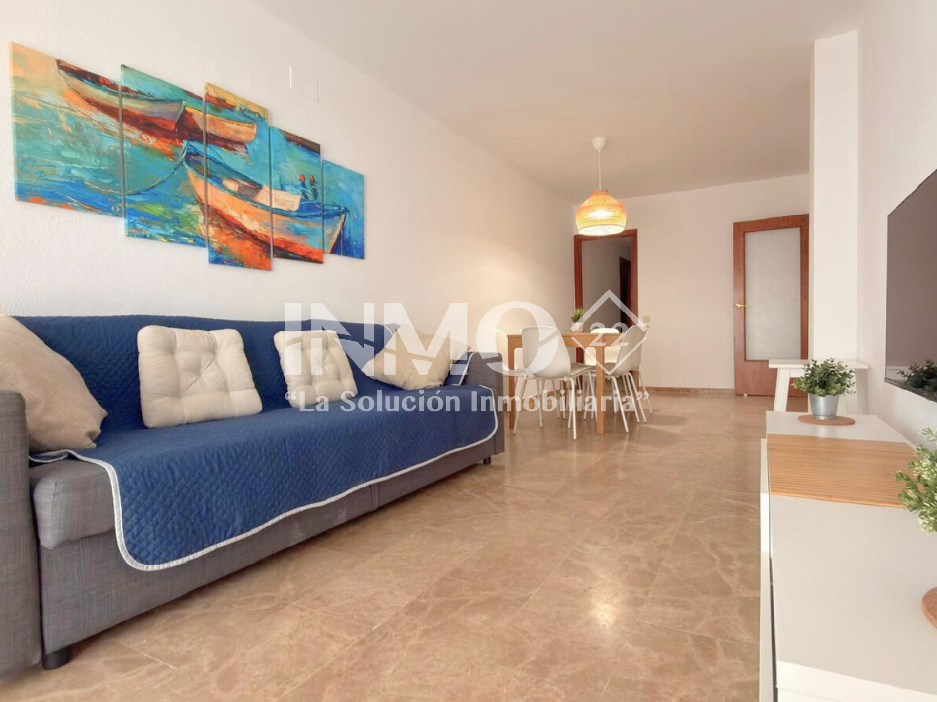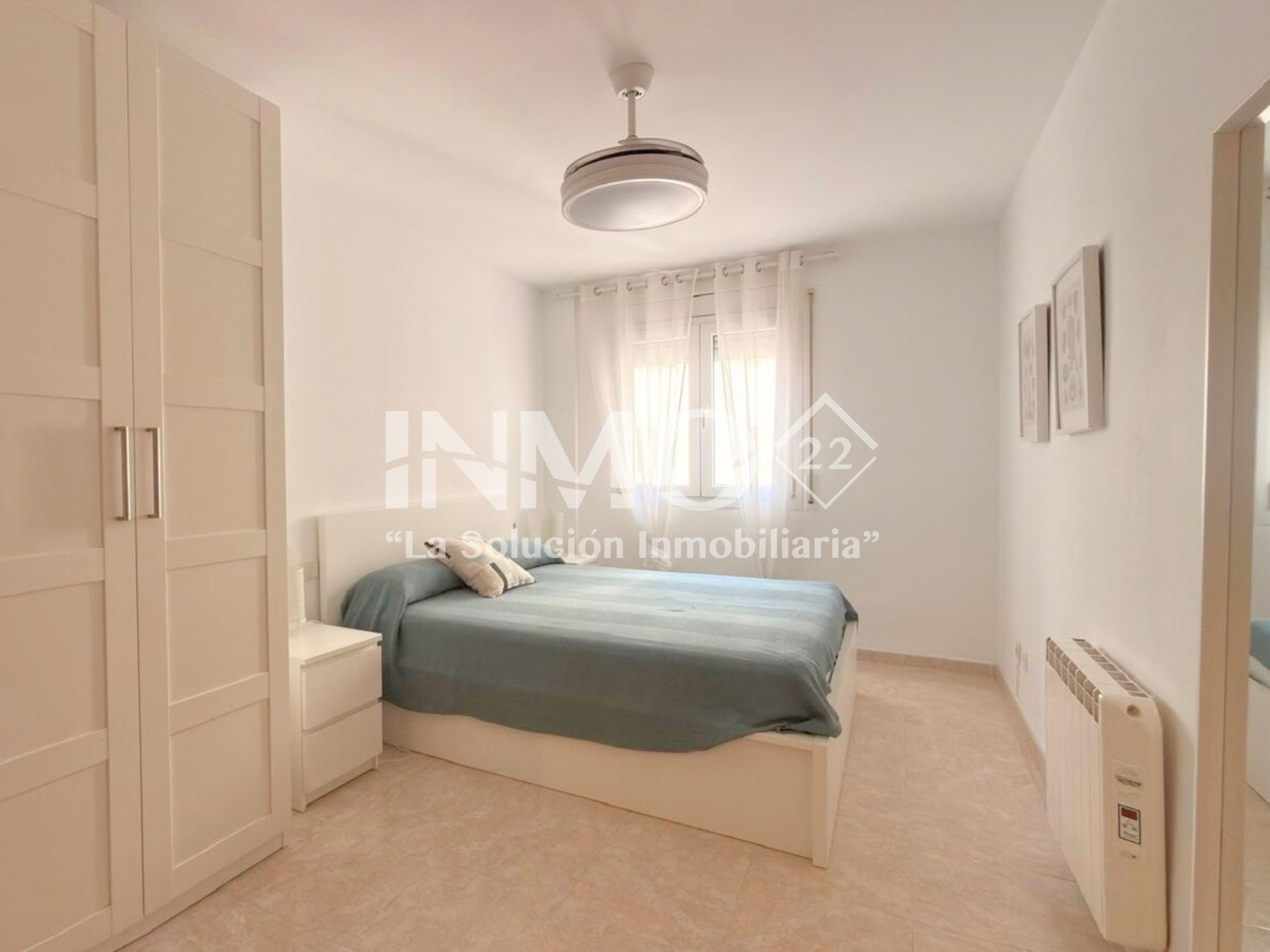 La vivienda dispone de tres habitaciones dobles, dos baños con ducha (uno en suite), cocina independiente y un amplio salón-comedor con acceso a una terraza con vistas al puerto y vista lateral al mar. El edificio cuenta con ascensor, piscina comunitaria, plaza de parking, aire acondicionado y ventiladores, para una estancia cómoda y agradable.
