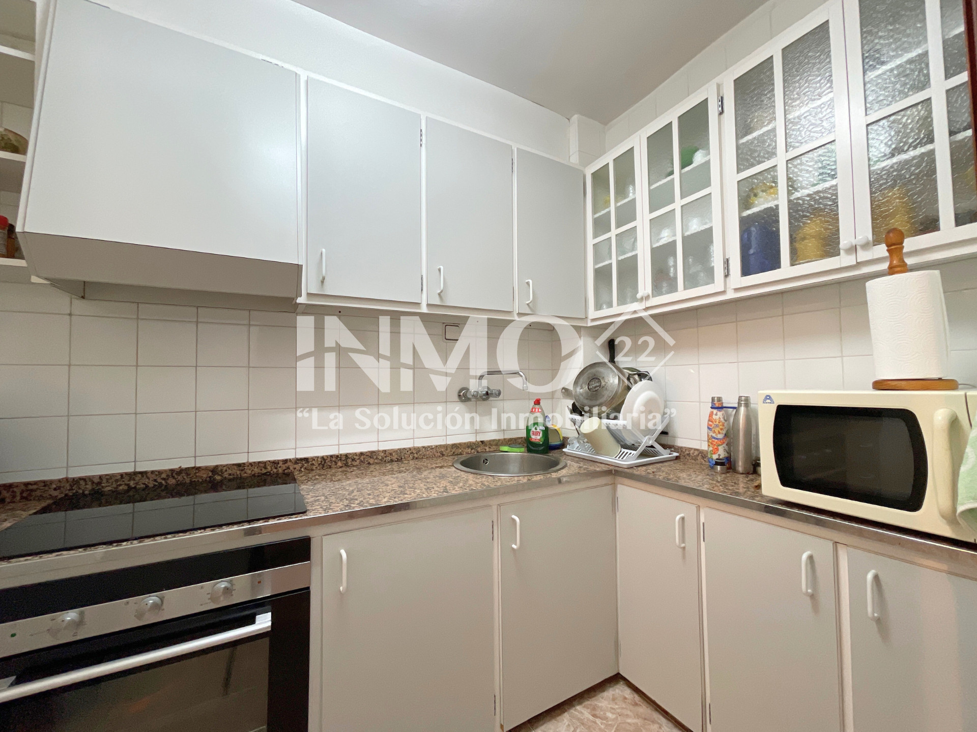 La cuisine, est équipée avec réfrigérateur, micro-ondes et four.